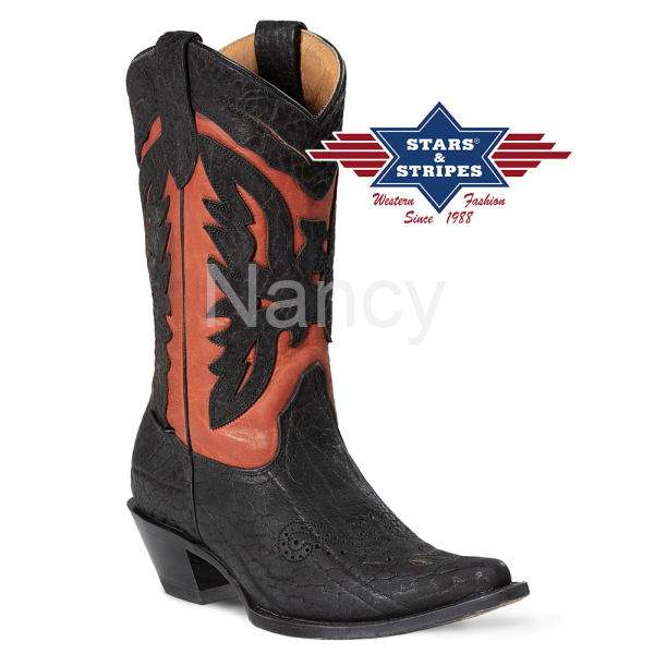 Dvoubarevné westernové boty vyrobené z vysoce kvalitní kůže, vyšívané a zdobené extravagantními aplikacemi. Stélka, podšívka, pata a vzorovaná podrážka jsou také vyrobeny z vysoce kvalitní kůže, ručně vyrobené podle tradičního mexického obuvnictví. Podešev je s Goodyearovým lemováním a zakončena prémiovým Goodyearovým lemováním.